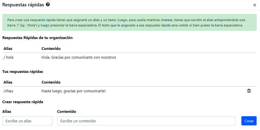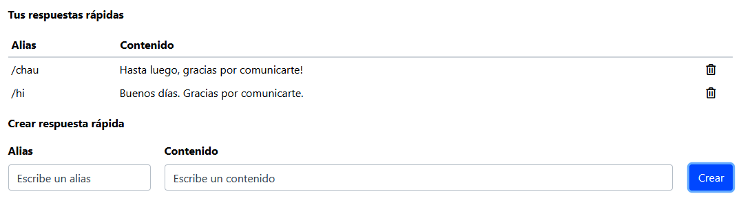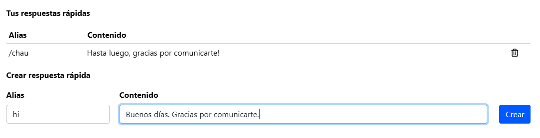 En la parte inferior podrá crear respuestas rápidas definiendo un alias y agregando el contenido. Al finalizar haga click en el botón "Crear" y la respuestas rápidas aparecerá en la lista.