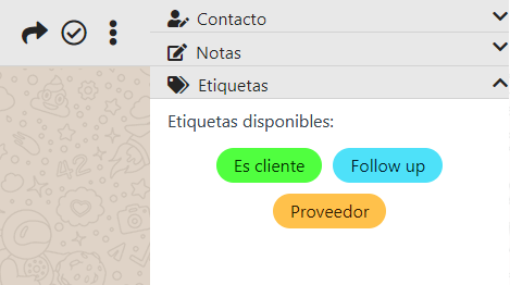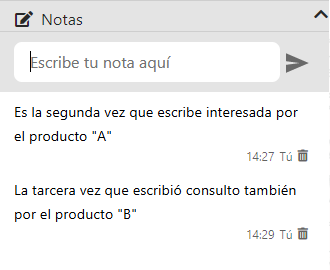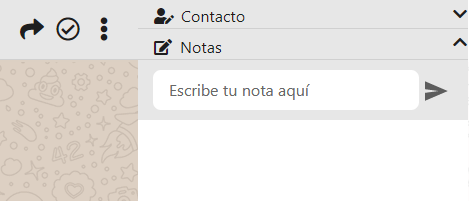 Para hacer uso de las notas, desde un chat, en la parte superior derecha de la pantalla chat, podrá observar tres íconos. Al hacer click en el tercero (tres puntos en forma vertical) se desplegará una barra lateral que contiene tres secciones. La segunda de ellas es notas.