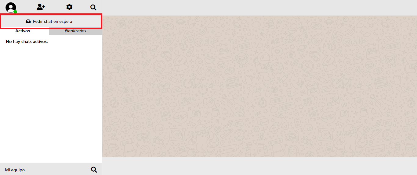 En la parte superior izquierda de la pantalla, encontrará el botón "Pedir chat en espera". Al hacer click en el, se abrirá la siguiente ventana: