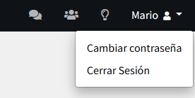 Ubicado en la parte superior derecha puede observar el nombre del usuario acompañado de una flecha. Al hacer click en el se deplegaran las opciones disponibles: