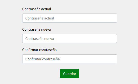 En la misma se pide la contraseña actual, la nueva contraseña y reiterar la nueva contraseña. Al hacer click en "Guardar", luego de una confirmación en el margen superior derecho de la pantalla, la plataforma redirige al chat.