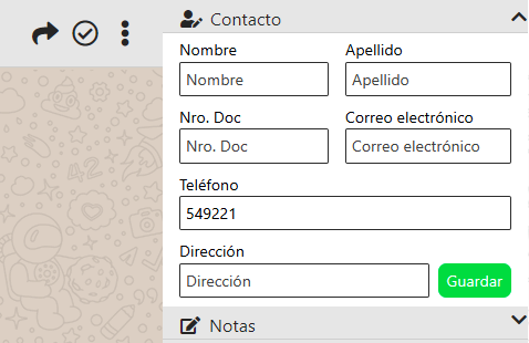 En su parte superior encontrará un desplegable, con el título "Contacto". Si nunca fue agendado el contacto, el único campo con datos será el número telefónico. Como puede observar, comienza con el código internacional (en caso de Argentina 54), seguido del código para teléfonos móviles (en caso de Argentina 9), seguido del código de área sin el "0" y número de teléfono.