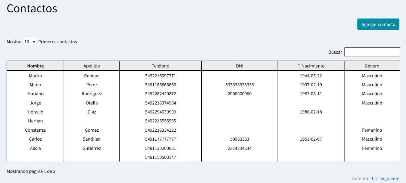 En esta pantalla se podrá ver una tabla que contiene todos los contactos existentes, un selector de cantidad de cantidad de contactos a mostrar, un buscador y un botón "Agregar Contacto".