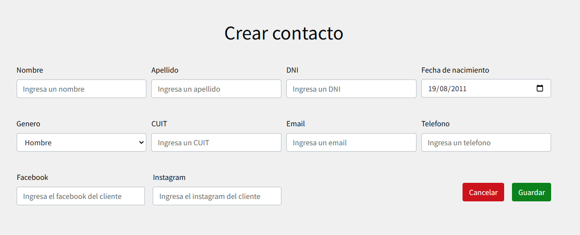 Desde la pantalla de contactos también podemos acceder a la creación de un nuevo contacto, dando click en el botón "Agregar Contacto". Está acción nos redirige a una página análoga a la de edición vista anteriormente: