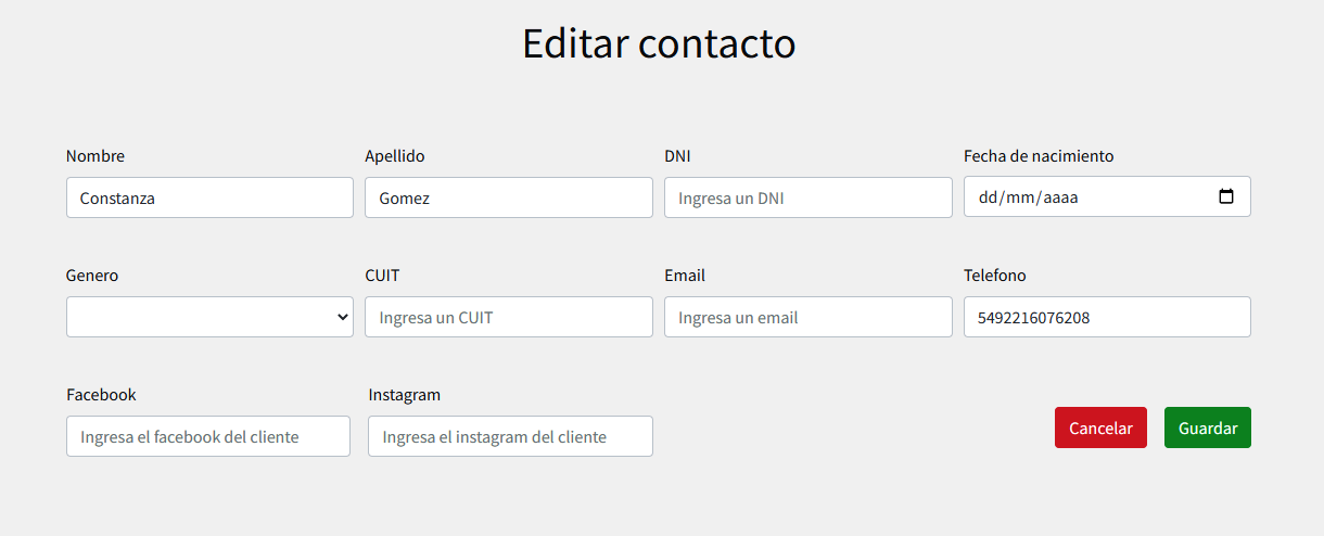 Para acceder a la edición de un contacto, solo debe ubicar el puntero del mouse sobre la fila que lo contiene y hacer click sobre ella. Esto nos redirige a la página de edición de ese contacto: